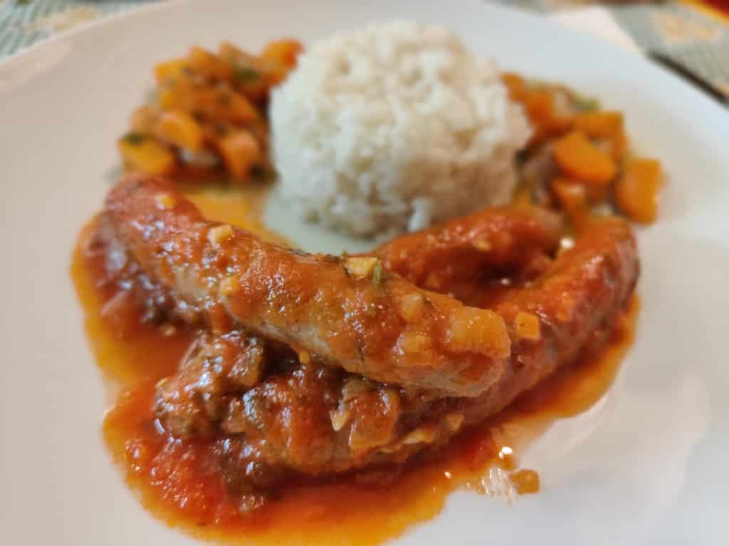 En el mismo aceite pochamos la cebolla a fuego medio. Seguidamente añadimos las salchichas y removemos un minuto